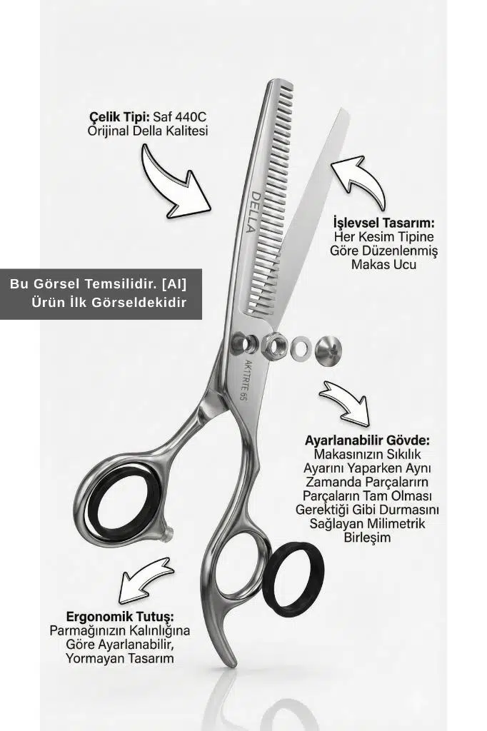 Sanatınızı kusursuz bir hassasiyetle buluşturun. Della Profesyonel Kuaför Makasları, saç kesiminde mükemmelliği arayan profesyoneller için özel olarak tasarlanmıştır. İthal 440C Japon çeliğinden üretilen bu seri, üstün keskinliği ve ergonomik yapısı ile kuaförlerin ve berberlerin vazgeçilmezi olmaya aday.