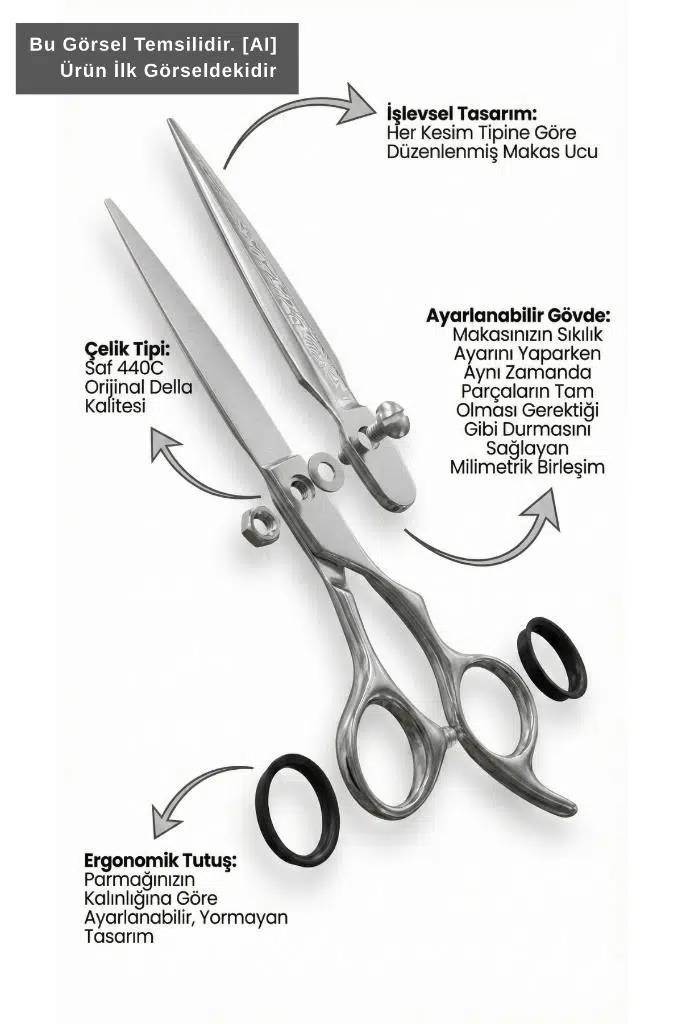 Sanatınızı kusursuz bir hassasiyetle buluşturun. Della Profesyonel Kuaför Makasları, saç kesiminde mükemmelliği arayan profesyoneller için özel olarak tasarlanmıştır. İthal 440C Japon çeliğinden üretilen bu seri, üstün keskinliği ve ergonomik yapısı ile kuaförlerin ve berberlerin vazgeçilmezi olmaya aday.