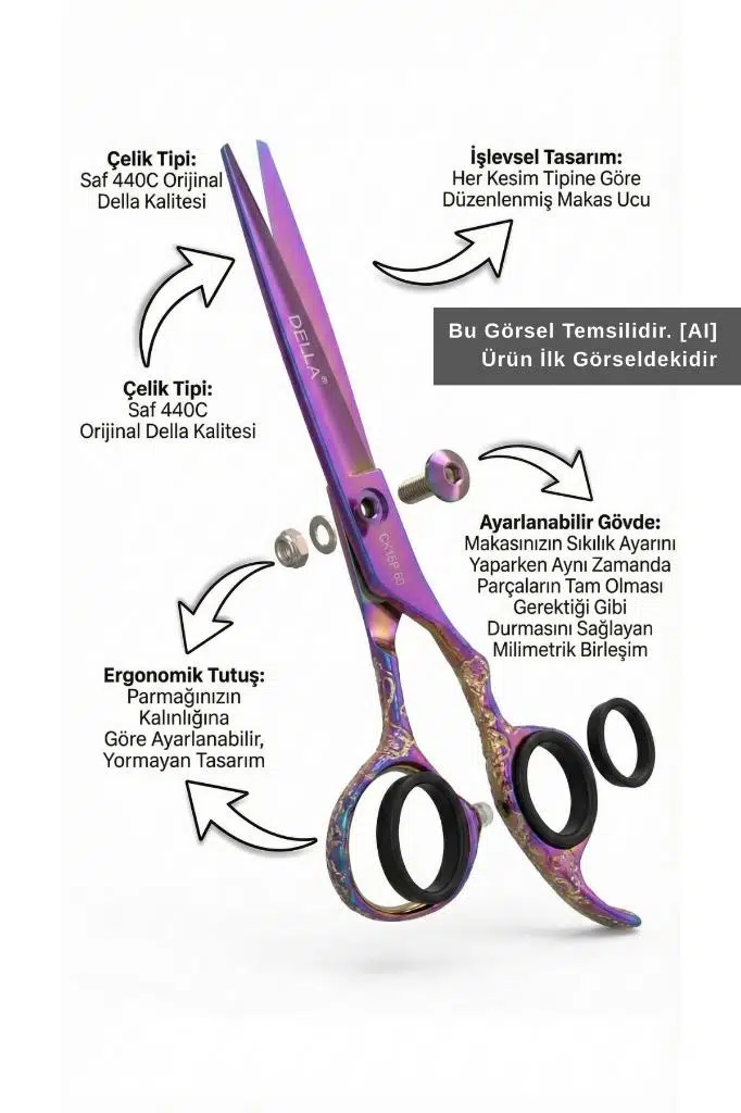 Sanatınızı kusursuz bir hassasiyetle buluşturun. Della Profesyonel Kuaför Makasları, saç kesiminde mükemmelliği arayan profesyoneller için özel olarak tasarlanmıştır. İthal 440C Japon çeliğinden üretilen bu seri, üstün keskinliği ve ergonomik yapısı ile kuaförlerin ve berberlerin vazgeçilmezi olmaya aday.