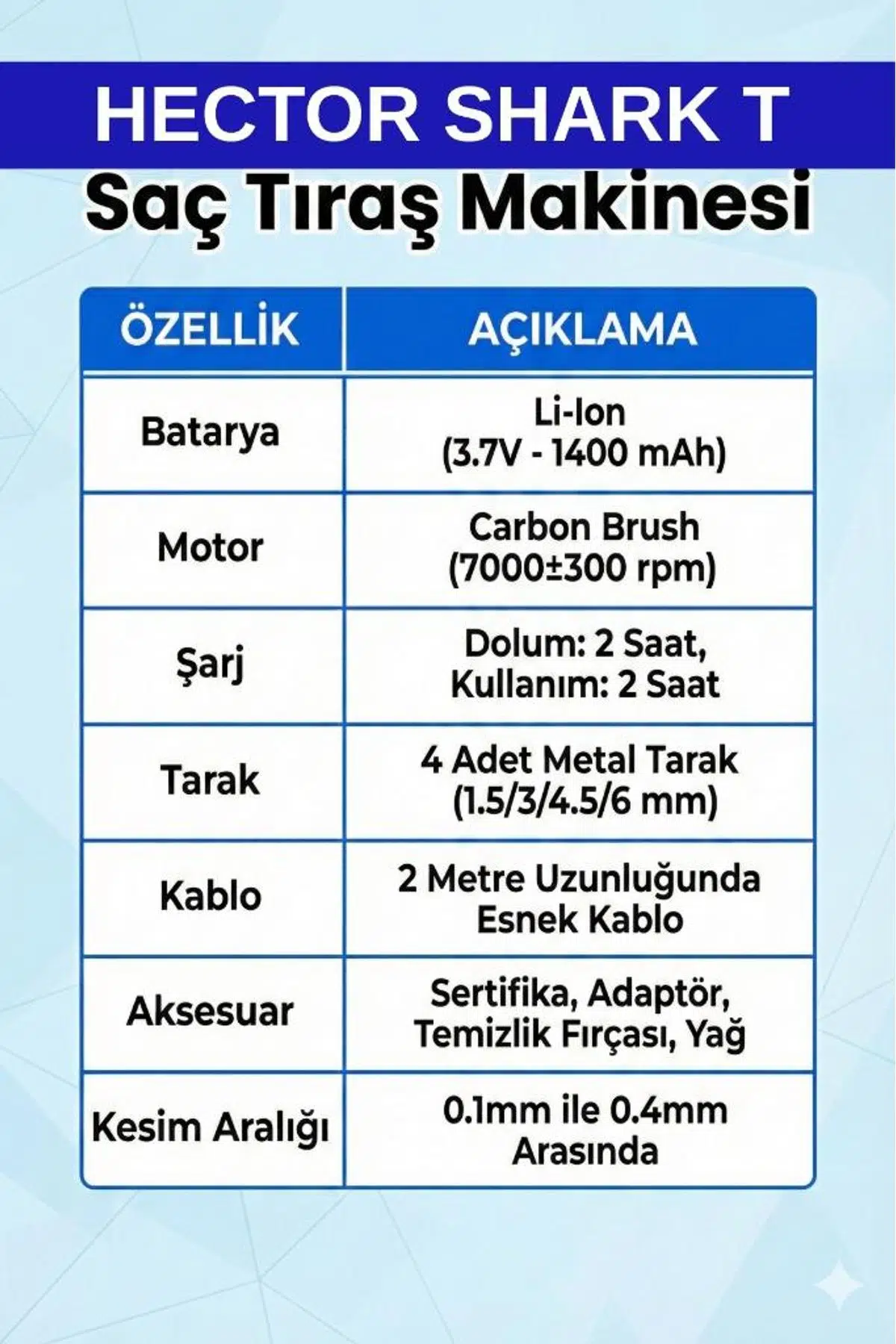 Hem profesyonel kullanım hem de kişisel bakımınız için tasarlanan Hector Shark T, keskin performansı ve ergonomik yapısıyla tıraş keyfini başka bir boyuta taşıyor. Özellikle sıfıra yakın kesimlerde (0.1mm) gösterdiği hassasiyetle favoriniz olmaya aday!
