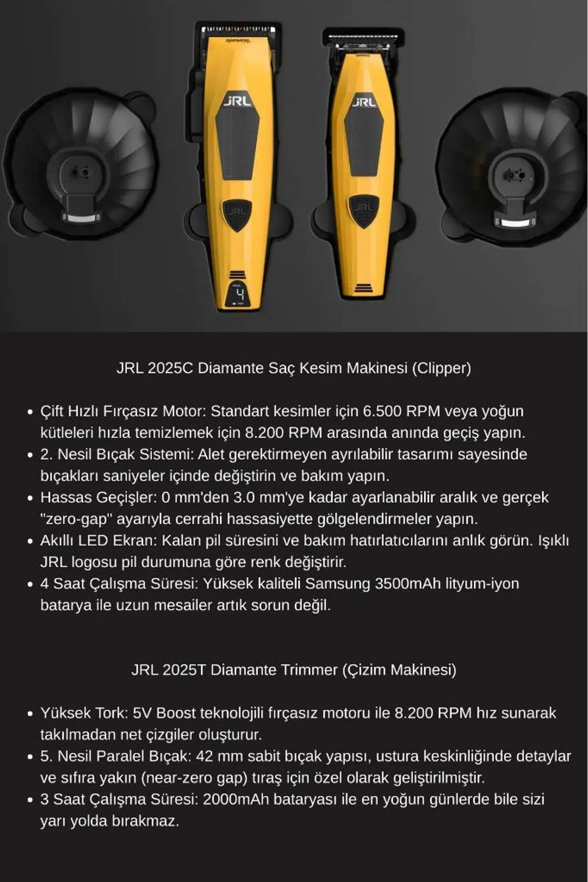 Profesyonel berberliğin zirvesine JRL Diamante Seti ile adım atın. Süper otomobillerden ilham alan estetiği hassas mühendislikle birleştiren bu seri, yoğun çalışan salonlar için yüksek performansın yeni tanımıdır. Kusursuz fade (gölgeleme) geçişlerinden en sert saçları temizlemeye kadar ihtiyacınız olan güç ve ergonomik kontrol burada.