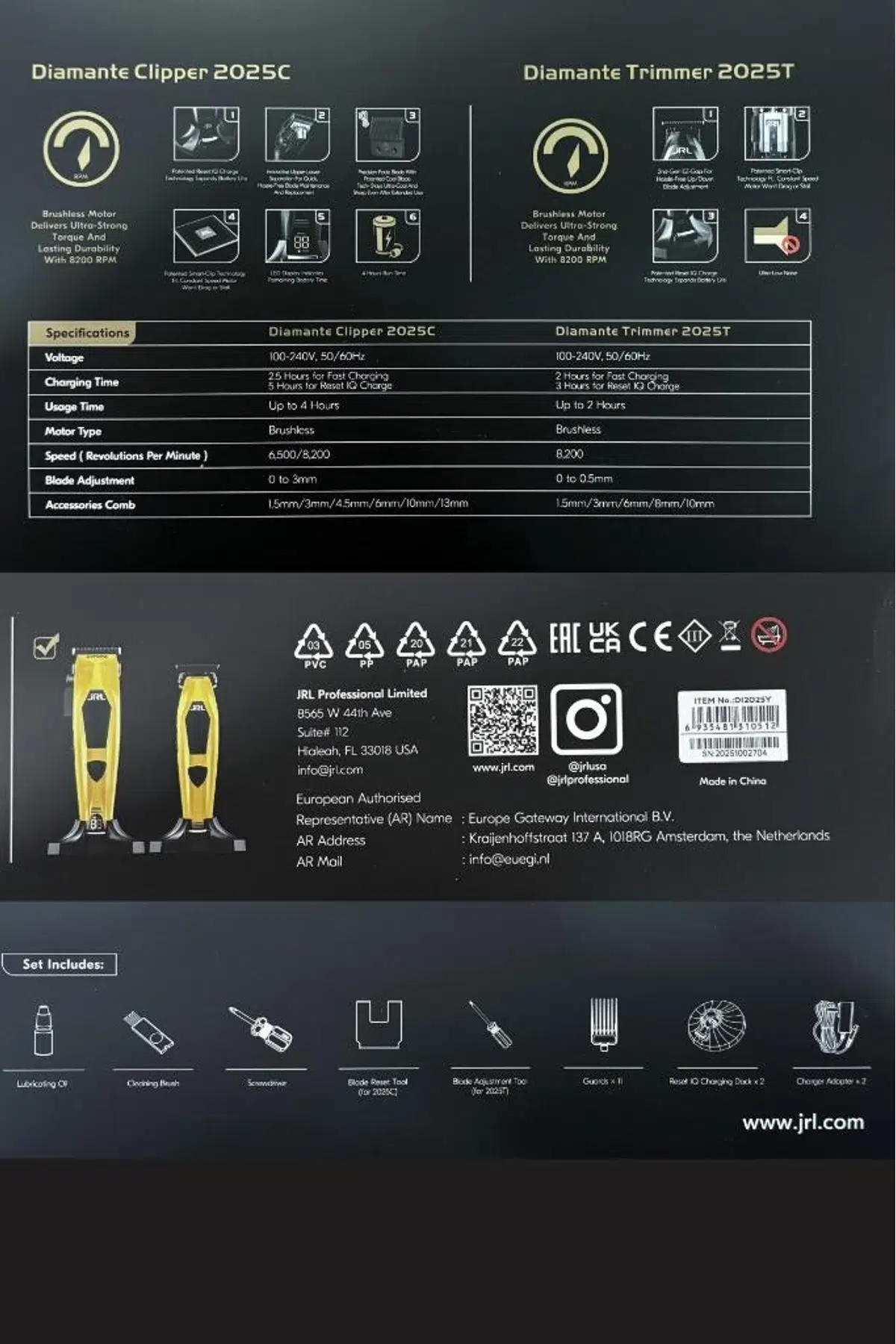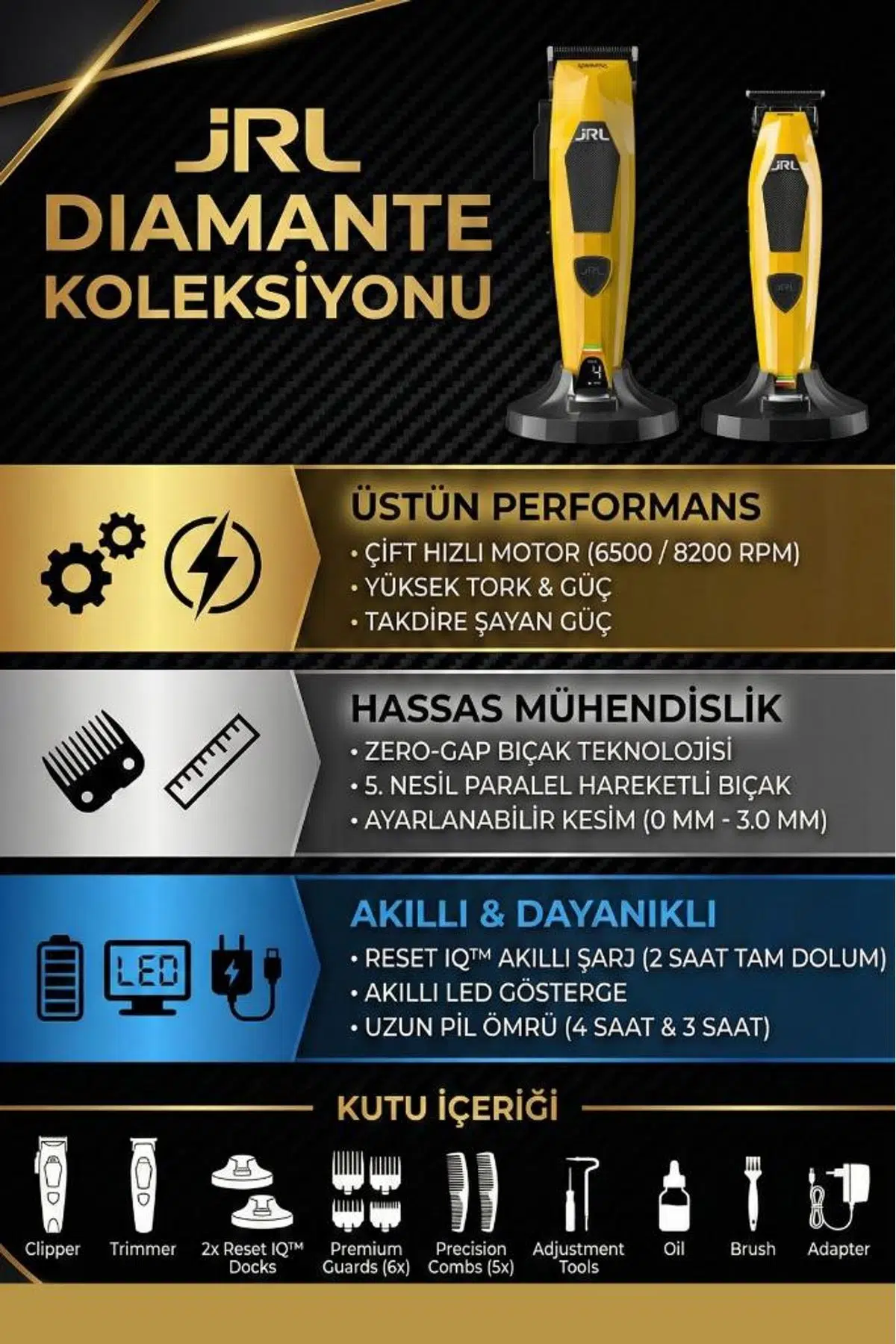 Bu premium koleksiyon, ustalığınızı konuşturmanız için iki ana parçadan oluşur: JRL 2025C Diamante Saç Kesim Makinesi ve JRL 2025T Diamante Trimmer. Her iki cihaz da ultra sessiz fırçasız motorlar, gelişmiş sıfırlama (zero-gap) teknolojisi ve devrim niteliğindeki Reset IQ™ şarj sistemiyle donatılmıştır.