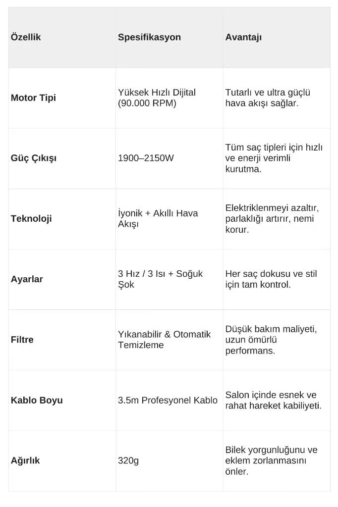 Akıllı Hava Akış Sistemi: Saçın nem dengesini korur, kurutma esnasında saçın yıpranmasını önler.