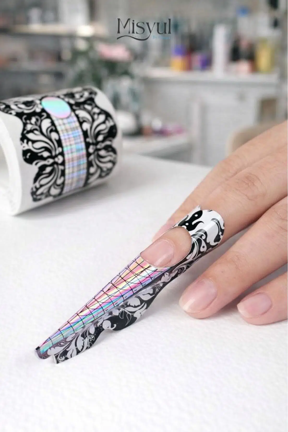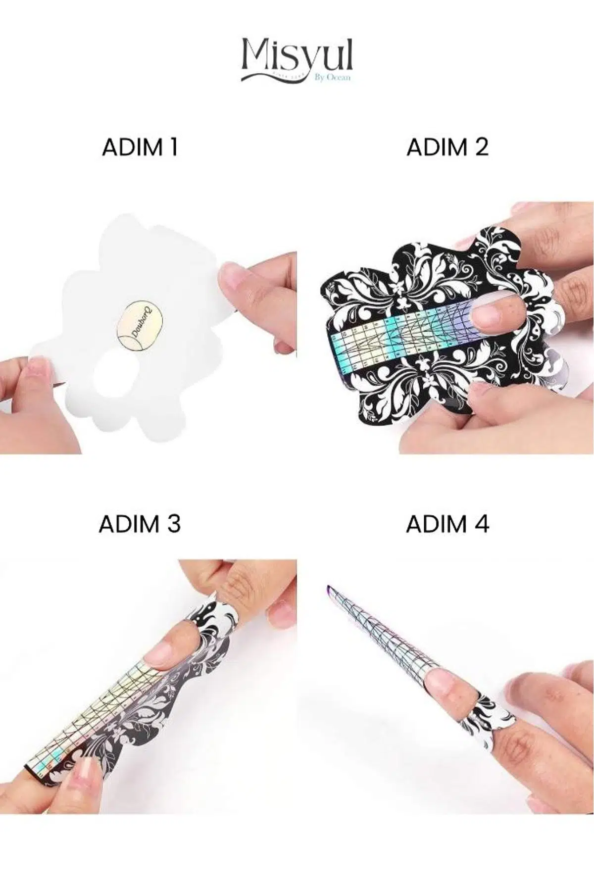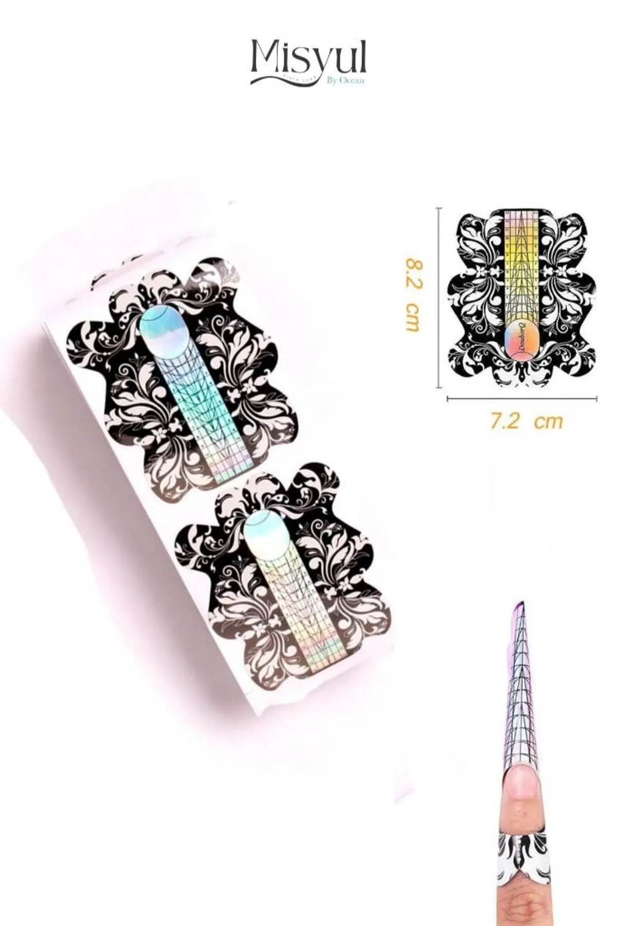 Tırnak sanatında sınır tanımayanlar için! Misyul (By Ocean) ASU-266-C1 şablon, özellikle ekstrem uzunluktaki (Stiletto, Long Coffin vb.) protez tırnak uygulamaları için özel olarak tasarlandı. Estetik siyah desenleri ve holografik ölçü skalasıyla işinize profesyonellik katar.