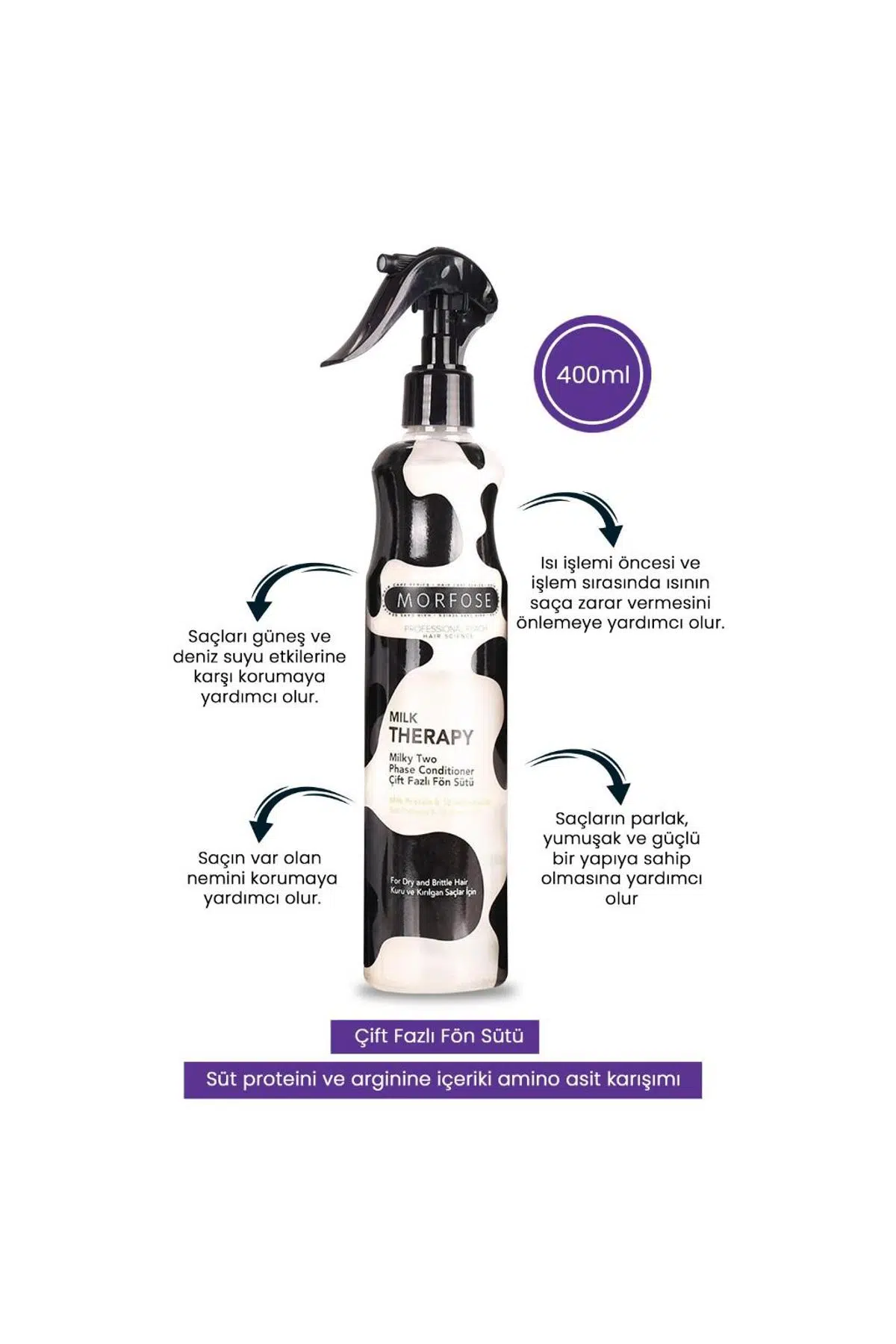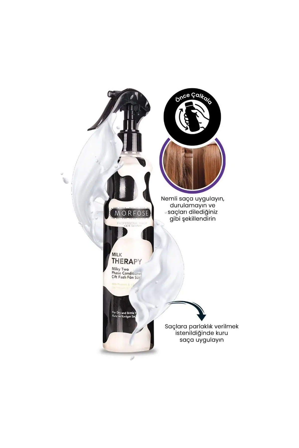 Morfose sütlü iki faz kondisyoner koruma ve saçlarınızın sıcağa, güneşe, denize ve nem karşıtı çevresel faktörlere karşı ihtiy olan bakımı .