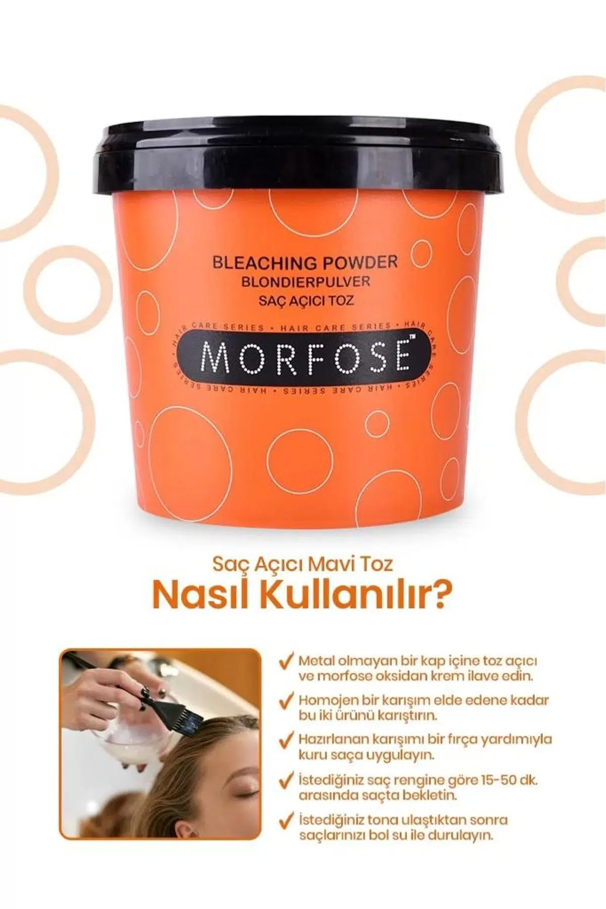 Metal olmayan bir kap içine toz açıcı ve Morfose Oksidan Krem (10,20,30,40 vol.)ilave edin.Homojen bir karışım elde edene kadar bu iki ürünü karıştırın. Hazırladığınız karışımı bir fırça yardımıyla kuru saça uygulayın. İstediğiniz saç rengine göre 15- 50 dakika arasında saçta bekletin. Bekleme sırasında, özellikle yıpranmış saçlarda saçlarınızı sık sık kontrol edin. İstediğiniz tona ulaştıktan sonra saçlarınızı bol su ile durulayın. Ardından şampuan ve saç kremi uygulayarak işlemi tamamlayın.