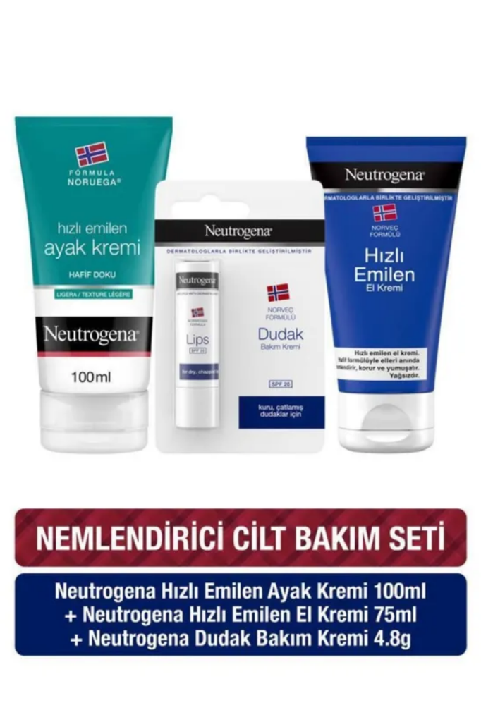 Neutrogena® Norveç Formülü Hızlı Emilen El Kremi ÖzellikleriGünün her saatinde kullanıma uygundur.Anında emilirHafif ve yağsız formülNeutrogena® Norveç Formülü Hızlı Emilen Ayak Kremi FaydalarıNorveç Formüllü® Hızlı Emilen Ayak Kremi’nin kuru ayakları 24 saat boyunca nemlendirdiği klinik olarak kanıtlanmıştır. Anında emici ve yağlı bir his bırakmayan özelliği ile ayakkabılarınızı hiç beklemeden giymenizi sağlar. Sağlıklı görünen ve ekstra yumuşak ayaklar için yoğun bir nemlendirme sağlar.Neutrogena® Norveç Formülü Güneş Koruma Faktörlü (SPF 20) Dudak Nemlendiricisi FaydalarıKurumuş ve çatlamış dudaklar için anında etkili ve uzun süreli rahatlamaNeutrogena® Norveç Formülü Güneş Koruma Faktörlü (SPF 20) Dudak Nemlendiricisi ÖzellikleriZengin nemlendirici formülü sayesinde kurumuş ve çatlamış dudakları yumuşatır.Dudaklarınızın görünümünü düzeltir.Her türlü hava koşullarına karşı uzun süre etkili koruma sağlar.SPF 20 Güneş Koruma Faktörü ile dudaklarınızı güneşin zararlı etkilerine karşı korur.Dermatologlar tarafından test edilmiştir.