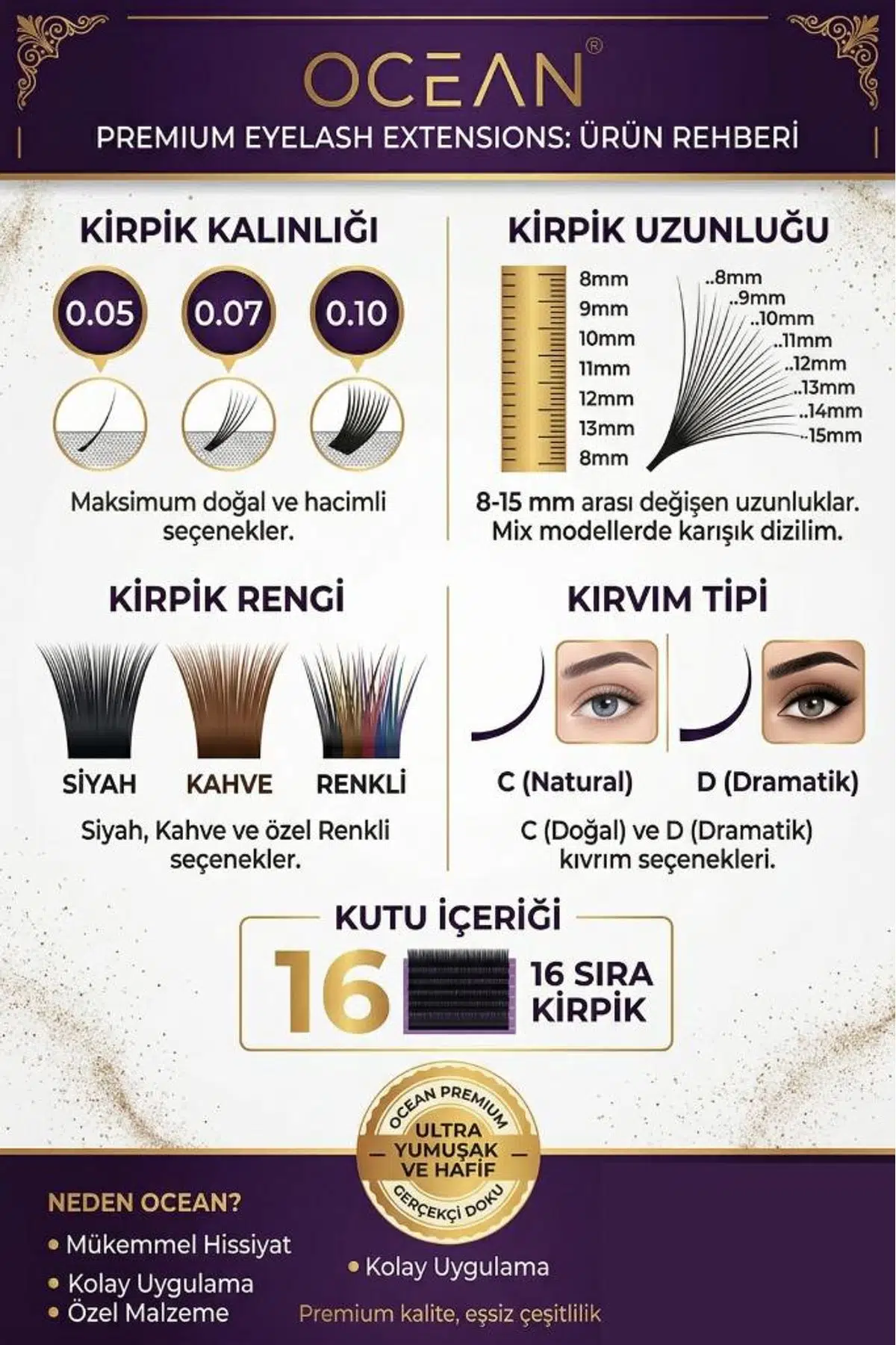 Kirpiklerin ağırlığı ve hacim etkisi seçilen kalınlığa bağlıdır. Ocean serisi, doğal kirpik sağlığını koruyan en hafif formüllere sahiptir: