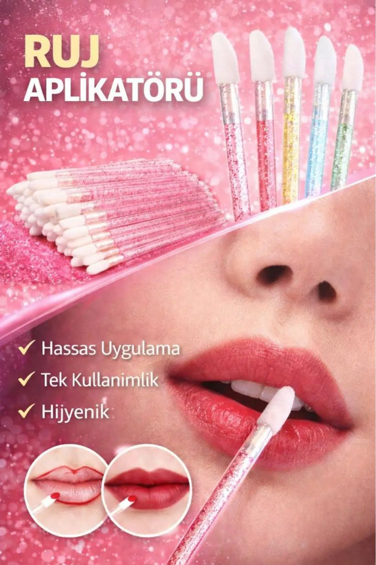 Ruju doğrudan dudaklara sürmek yerine bu aplikatörü kullanmak, özellikle birden fazla kişinin kullandığı ürünlerde (test ürünleri gibi) sağlığınızı korur. Ayrıca likit rujların dudak kenarlarından taşmasını önleyen kontrollü bir tutuş sağlar.