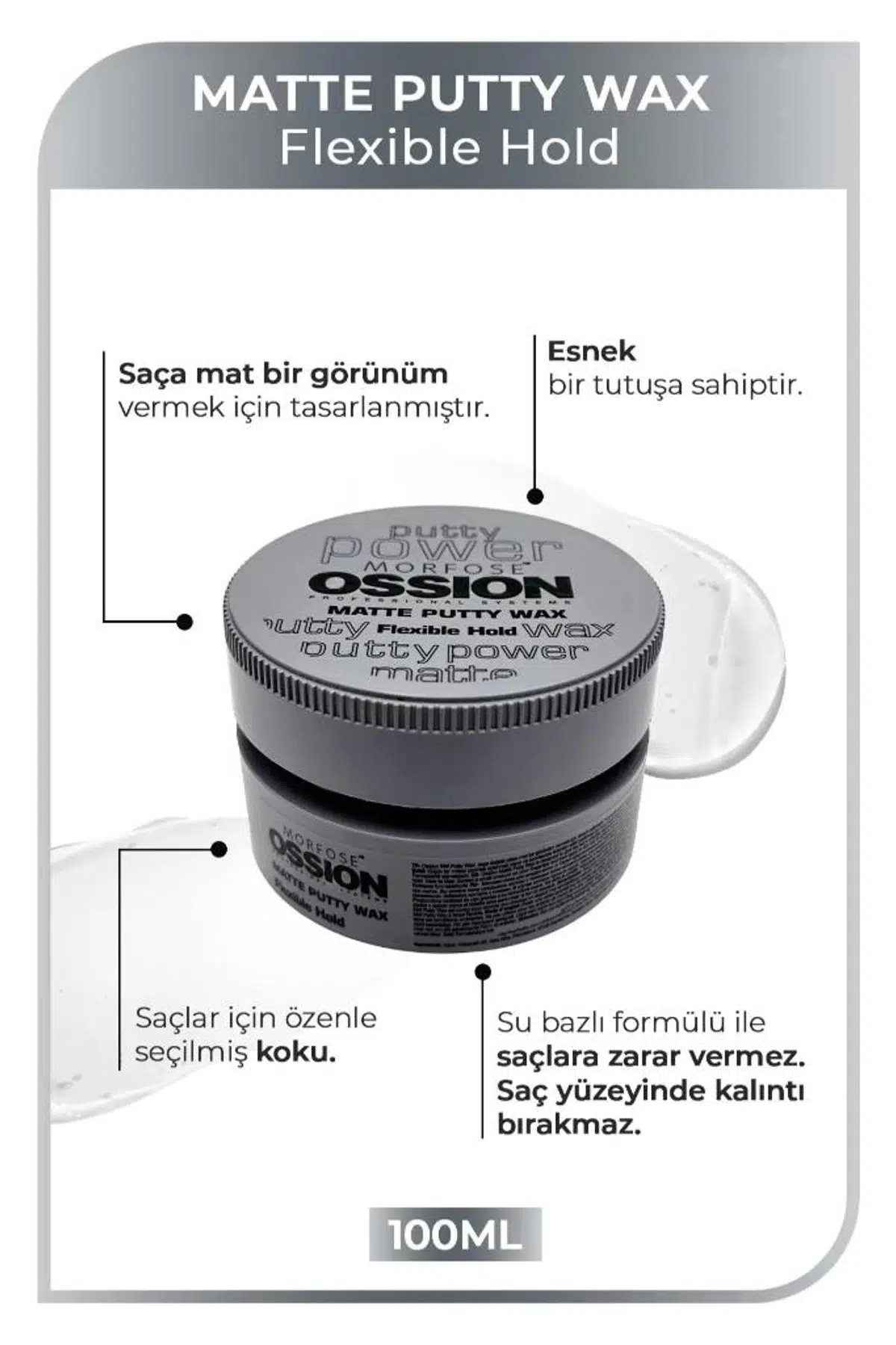 Ossion Matte Putty Wax, saça mat bir görünüm vermek için dizayn edilmiştir. Kremsi yapısı sayesinde kullanım kolaylığı sağlar. Flexible (yumuşak) bir tutuşa sahiptir. Su bazlı formülü ile saçlara zarar vermez.