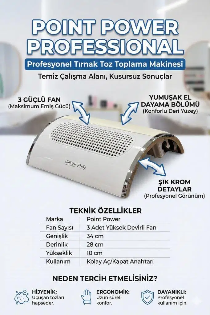 Protez tırnak ve manikür işlemlerinizde hem kendi sağlığınızı hem de müşterinizin konforunu korumak artık çok daha kolay. Point Power Professional, güçlü emiş performansı ve şık tasarımıyla çalışma masanızın en sadık yardımcısı olacak.