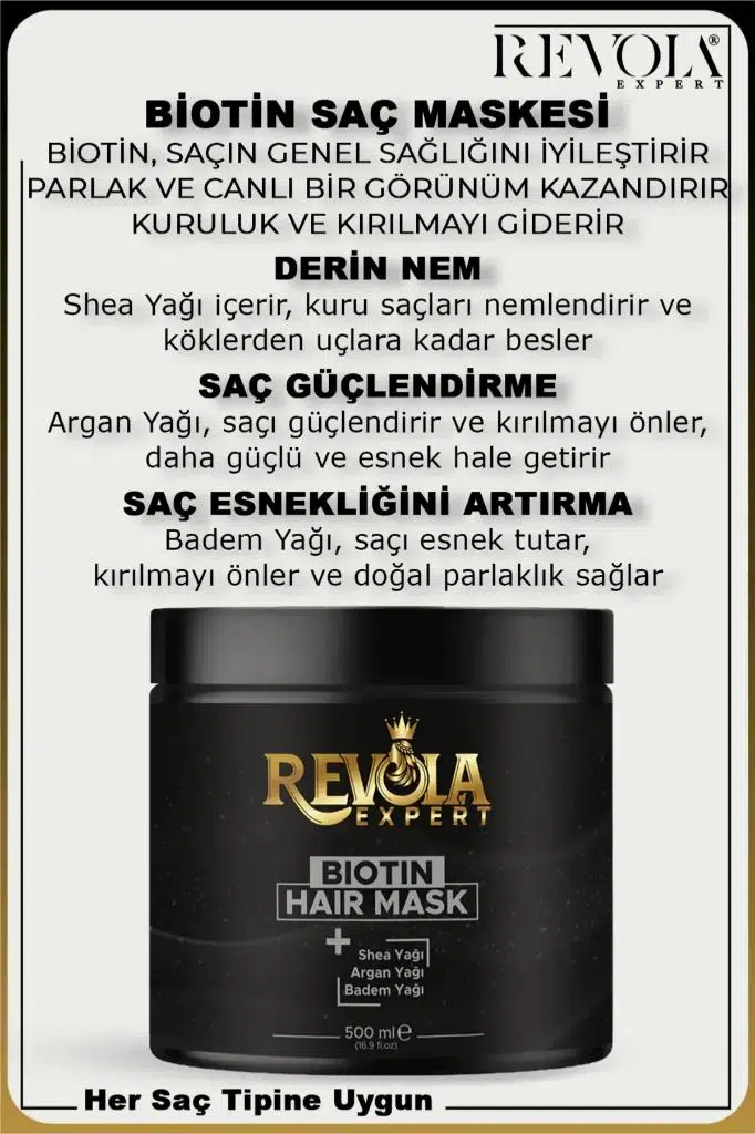 Revola Biotin Saç Maskesi, yıpranmış, kuru ve kırılgan saçlar için özel olarak geliştirilmiş bir bakım ürünüdür. İçeriğindeki biotin, keratin, argan yağı ve 7 doğal yağ ile saçlarınıza derinlemesine bakım yapar.