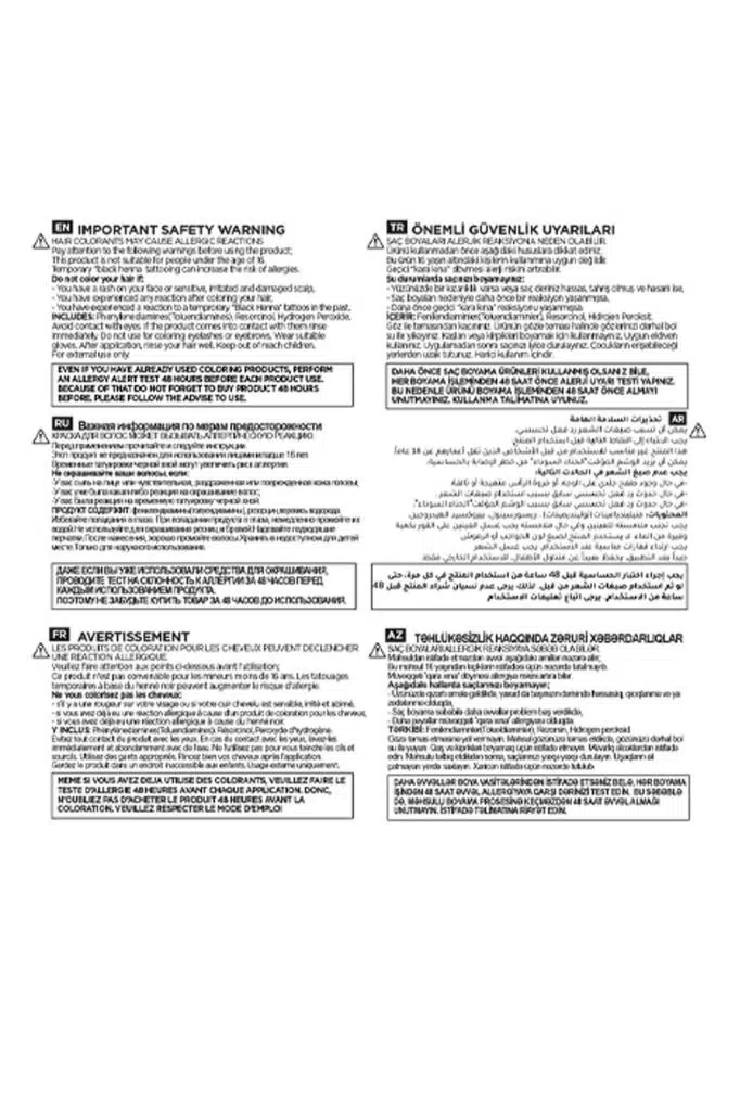 Uyarı ve Güvenlik Bilgileri: Saç boyaları alerjik reaksiyona neden olabilir. Ürünü kullanmadan önce aşağıdaki husulara dikkat ediniz; Bu ürün 16 yaşın altındaki kişilerin kullanımına uygun değildir. Geçici 'kara kına' dövmesi alerji riskini artırabilir. Şu durumlarda saçınızı boyamayınız. Yüzünüzde bir kızarıklık varsa veya saç deriniz hassas, tahriş olmuş ve hasarlı ise, saç boyaları nedeniyle daha önce bir reaksiyon yaşanmışsa, daha önce geçici 'kara kına' reaksiyonu yaşanmışsa. Göz ile temasından kaçınınız. Ürünün gözle teması halinde gözlerinizi derhal bol su ile yıkayaınız. Uygun eldiven kullanınız. Uygulumadan sonra saçınızı iyice durulayınız. Çocukların erişebileceği yerden uzak tutunuz. Harici kullanım içindir. 25 C oda sıcaklığında tercihen karanlık ve kuru bir yerde muhafaz ediniz.