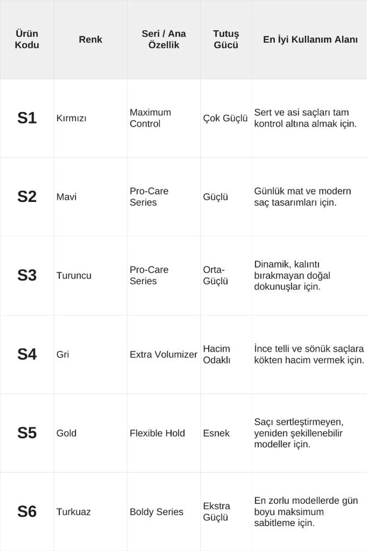 S1 (Kırmızı) - Maksimum Kontrol: Serinin en güçlülerinden biridir. Asi, sert ve zor şekil alan saçları gün boyu tam kontrol altında tutmak için tasarlanmıştır.