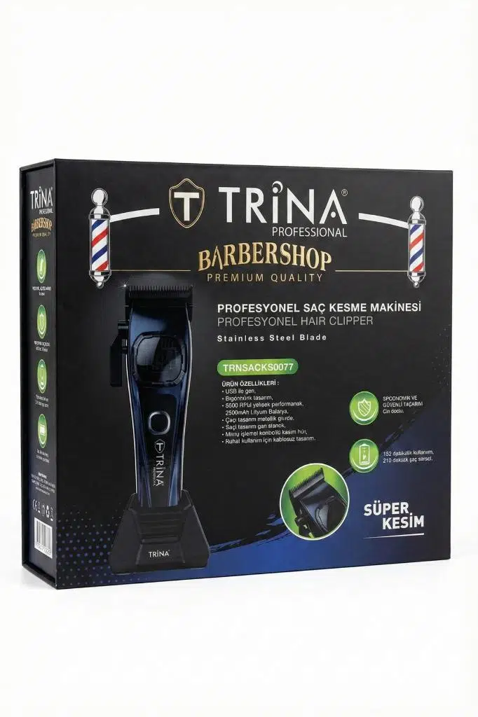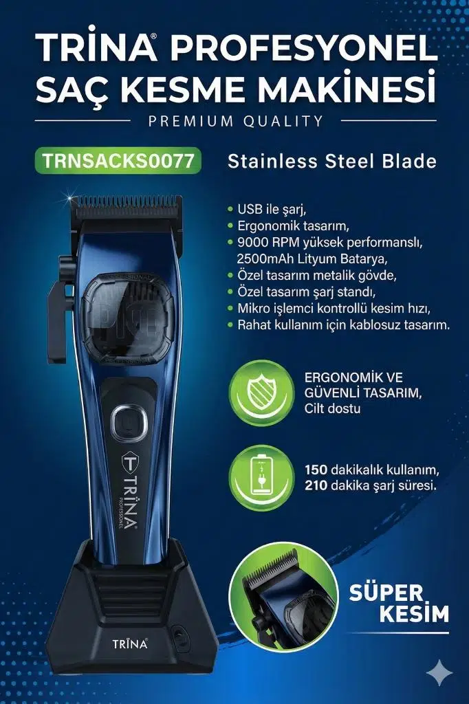 Trina Profesyonel Saç Kesme Makinesi, modern teknolojiyi şık bir tasarımla birleştirerek hem profesyonel kuaför salonları hem de evde üst segment bir deneyim arayanlar için tasarlandı. 9000 RPM motor gücü ve paslanmaz çelik bıçakları ile en zorlu saç tiplerinde bile pürüzsüz ve hızlı sonuçlar verir.